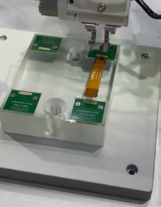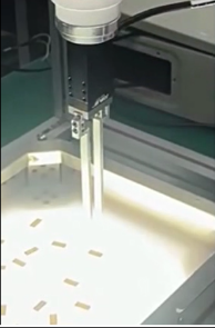 此工位需要将极易刮伤的CMOS传感器芯片从料盘中吸取并精准贴装到PCB板上。夹爪负责在吸嘴贴装前,先拨开料盘上的保护盖片。要求动作轻巧、绝对可靠。电动夹爪凭借其精准的力控(设定为仅0.8N),轻柔地夹取盖片边缘并将其翻折,完美避免了任何对下方敏感芯片的潜在冲击或刮擦,实现了100%的可靠性。